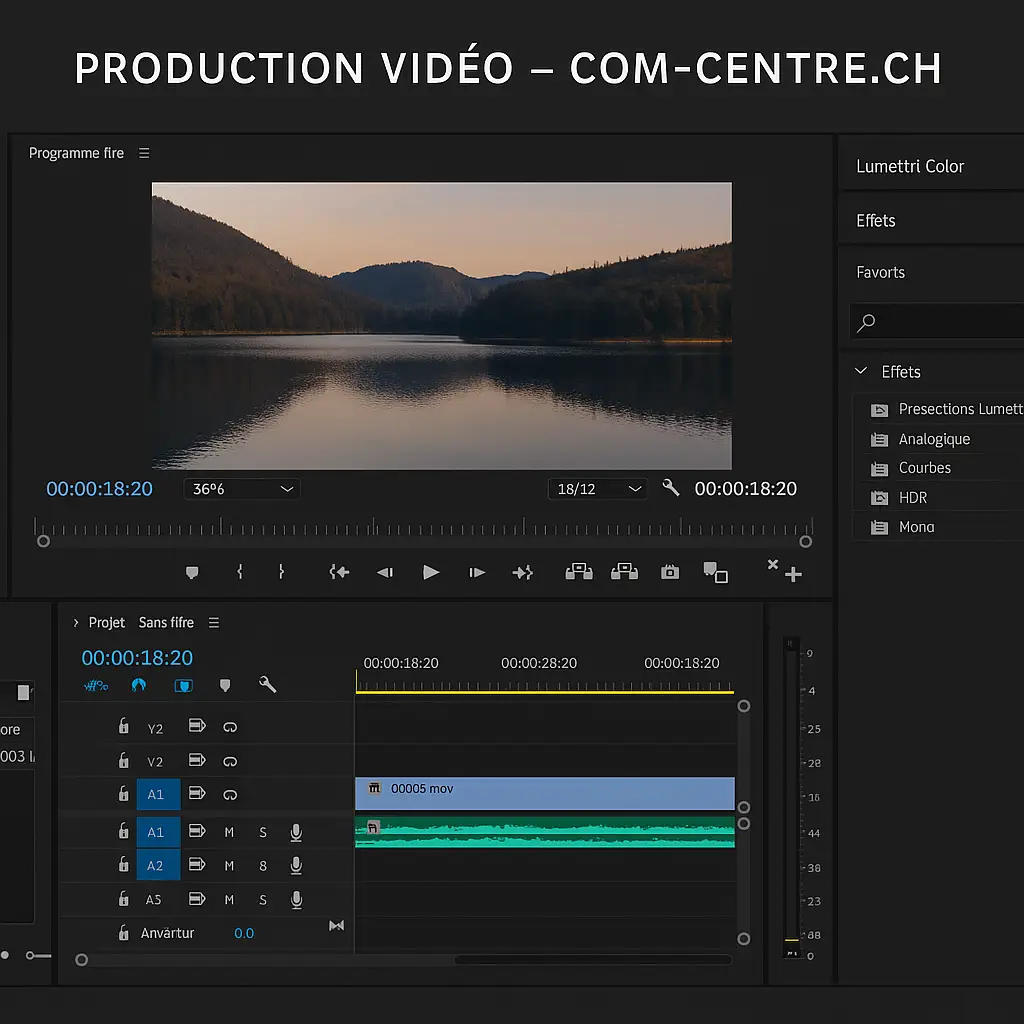 Dérushage, montage image/son, habillages et titrages, motion design si besoin. Étalonnage (color grading) pour une image homogène, mixage audio (musique, voix, ambiances), sous-titres si souhaités. Vous recevez un 1er export pour retours (allers-retours inclus selon devis).